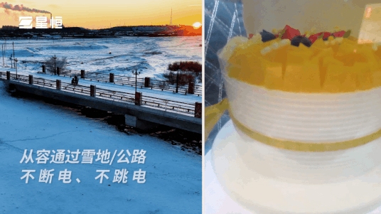 动力稳定输出。创新采用低粘度溶剂体系和低阻抗成膜添加剂的电解液,电池内部离子迁移速率大幅提升,确保稳定持续的能量供给。测试中,车辆装载蛋糕穿越雪地、颠簸路段等多种复杂路况,全程电力输出平稳,蛋糕完好无损,验证了电池在极寒条件下的稳定放电性能。