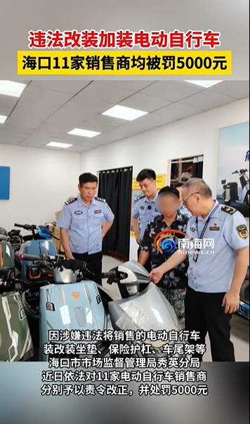 海口秀英累计查获11家电动自行车销售商,非法加装电动自行车43辆,分别处罚5000元,并予以责令改正。还有江苏宿迁、山东德州等地的改装车队深夜炸街,被公安交警扣车查处。