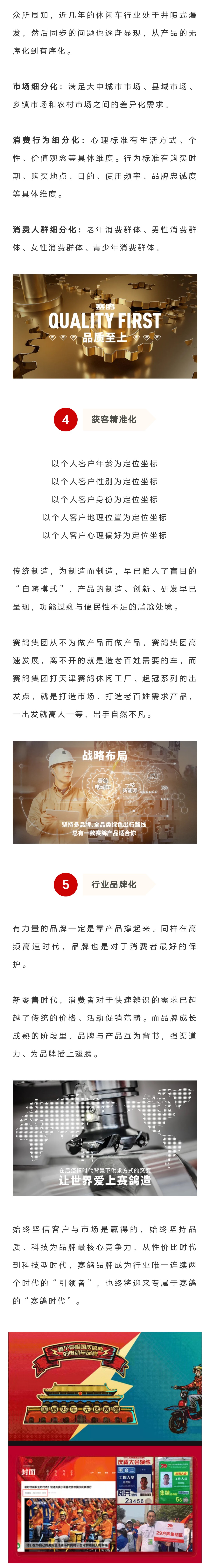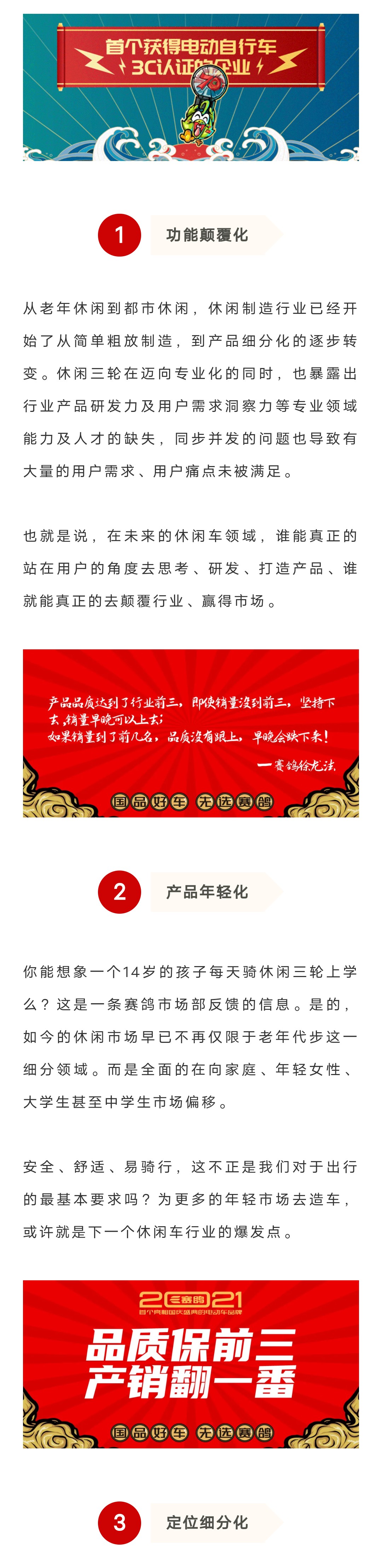 赛鸽集团从不为做产品而做产品,赛鸽集团高速发展,离不开的就是造老百姓需要的车,而赛鸽集团打天津赛鸽休闲工厂、超冠系列的出发点,就是打造市场、打造老百姓需求产品...