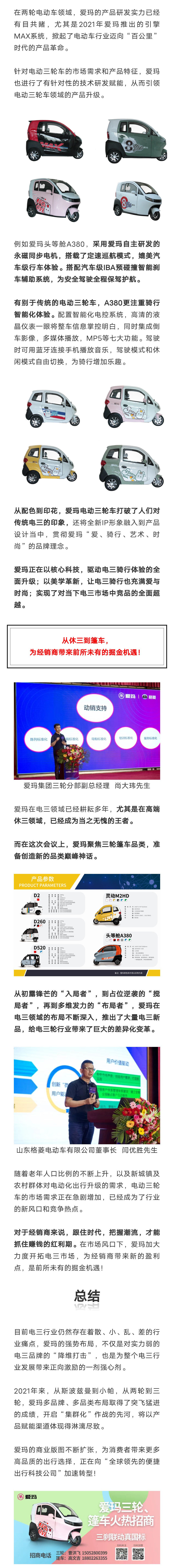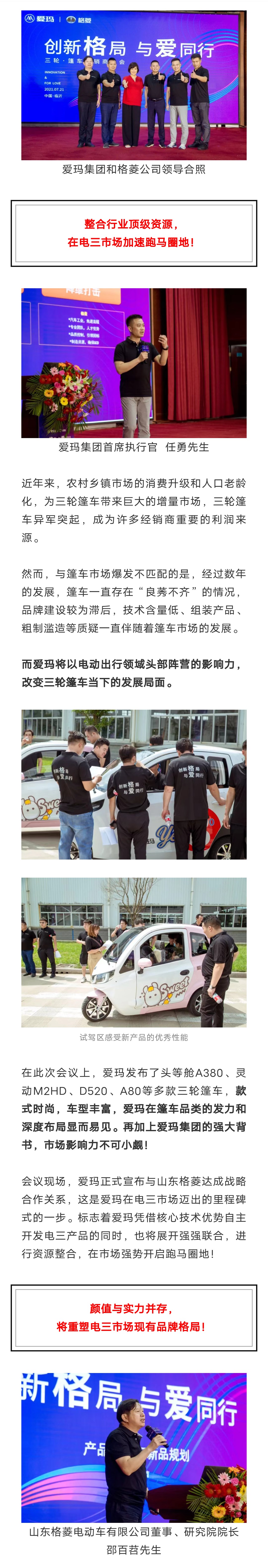 7月21日,爱玛在山东沂南召开“创新格局·与爱同行”经销商会议,不仅发布了多款电三新品,并且隆重开启了电三轮的渠道招商工作,强势发力三轮车市场!...