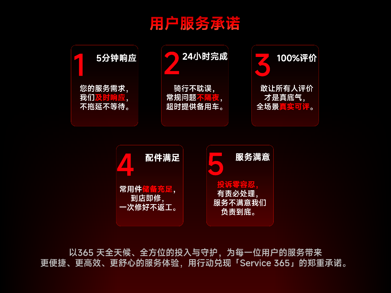 【24小时完成】 ——骑行不耽误, 常规问题不隔夜,超时提供备用车。