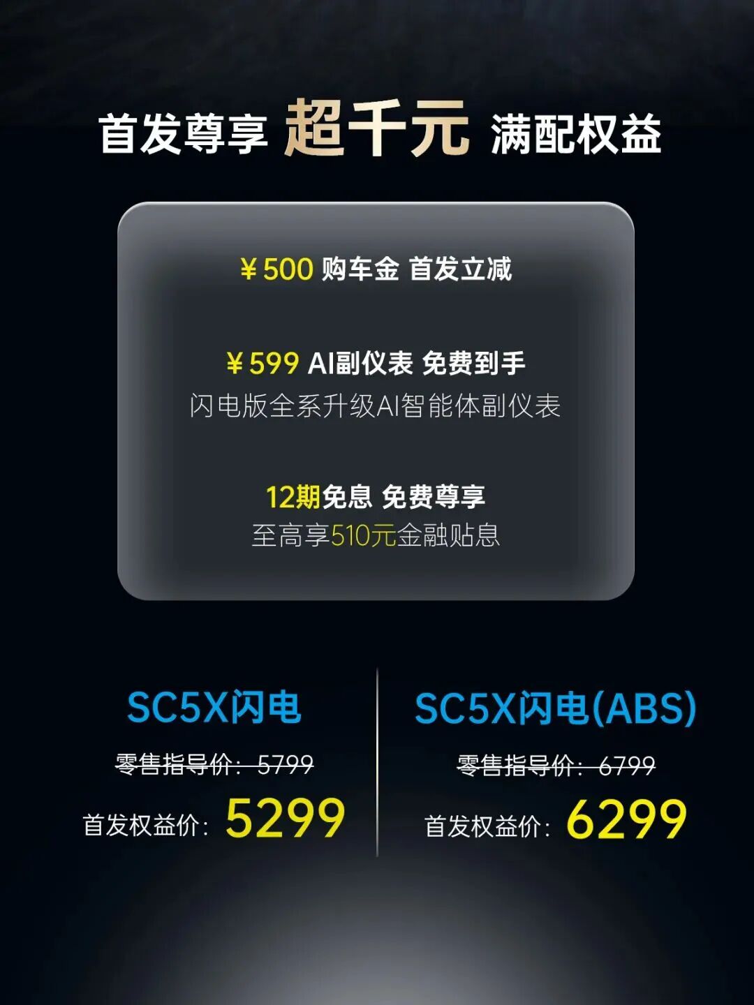 3月28日晚,霓星科技在抖音直播间发布了SC5X闪电版——标准版首发权益价5299元,ABS版6299元。同步亮相的还有品牌年度主张“骑出你的新花样”,以及后续OTA升级、电轻摩CC3等产品节奏。