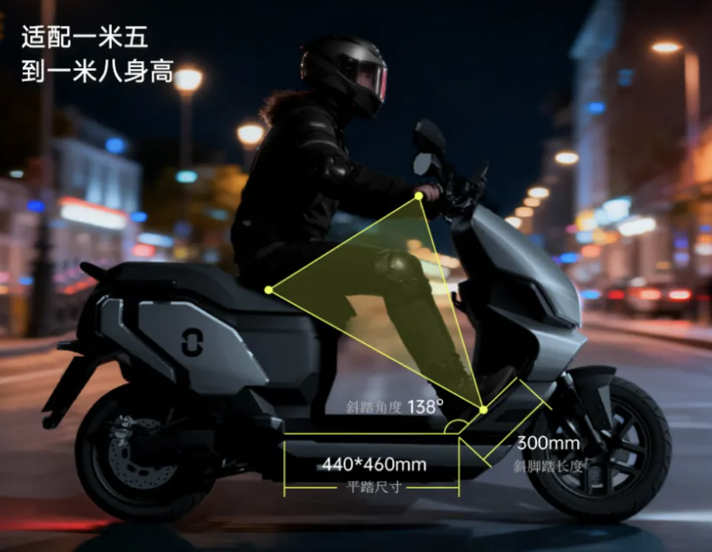实用性也没落下。138°斜踏、440mm加长踏板、5段可调后减震,长途骑行不累人;31L座桶能放下一顶全盔,120mm前置物槽加上宽敞踏板,20寸登机箱轻松塞进去。通勤买菜、周末郊游、短途载物,一车搞定。