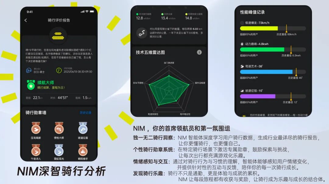 T-Ride自适应动力模式会学习你的骑行习惯,自动匹配合适的动力输出,骑得越久,车越像你的专属坐骑;全场景安全预警实时感知路况,主动提醒上坡下坡溜车、过弯侧倾、雨天轮胎湿滑,像个隐形的安全员;骑行结束后还会生成专属报告和成长勋章,每次出行都有点小成就感。手机互联、NFC感应解锁、电子围栏、一键寻车这些基础智能配置,当然也全系标配。
