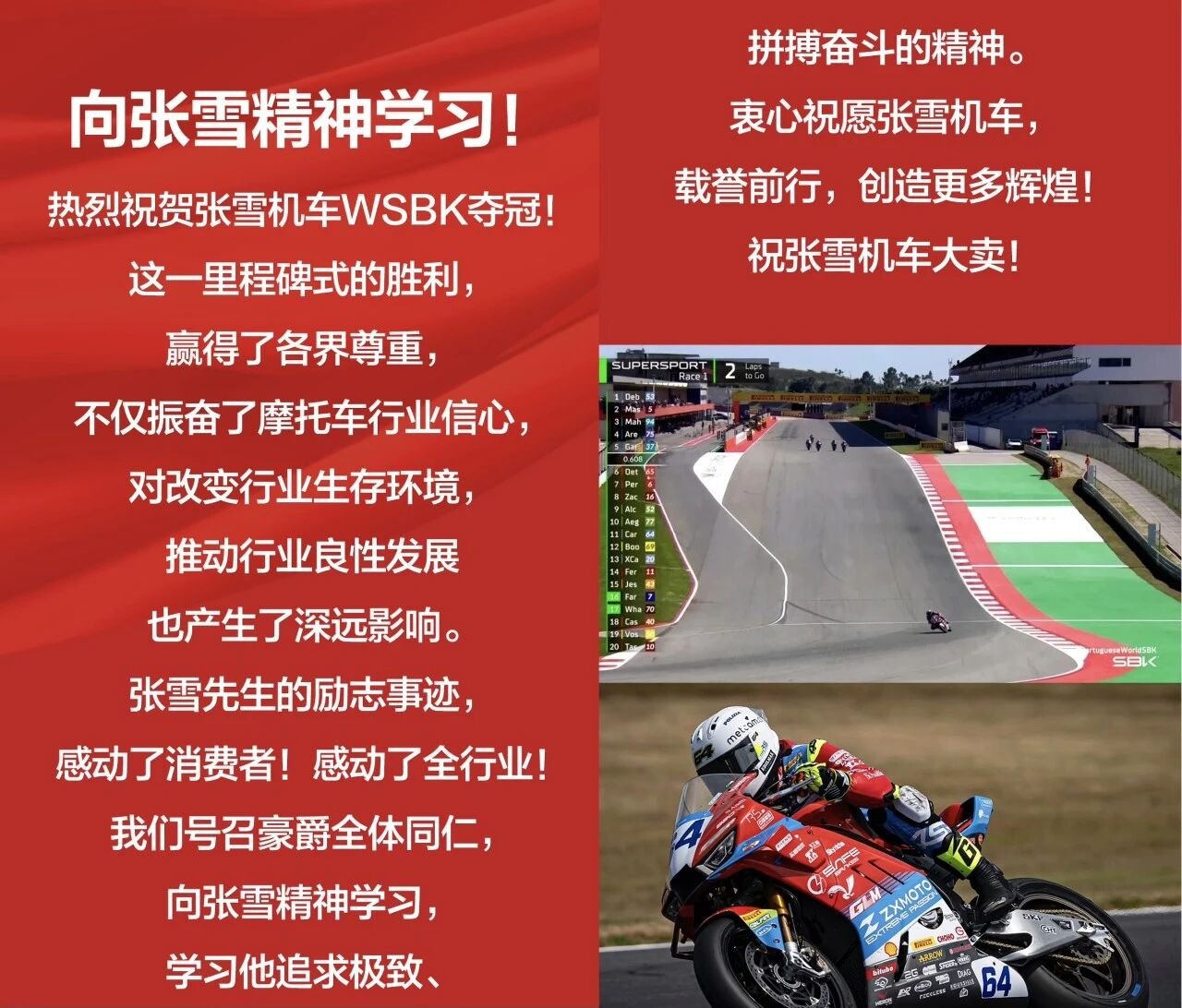 众所周知,张雪机车与豪爵摩托本来属于同一赛道的竞争对手,但是张雪的行为令人钦佩,对于豪爵来说,“被对手尊重和赞赏”是一种至高的荣幸。于是豪爵官方专门发文《向张雪精神学习》!