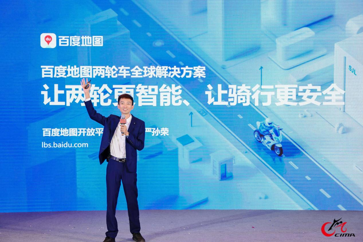 百度地图开放平台总经理严孙荣以“让两轮车更智能,让骑行更安全”为主题分享时介绍,百度地图自2005年推出后持续升级,除导航功能外,通过开放平台赋能各行业,服务超380万开发者及60万个APP,核心优势是全球海量精准数据,含3.4亿POI、7000万路网及独有全景数据。