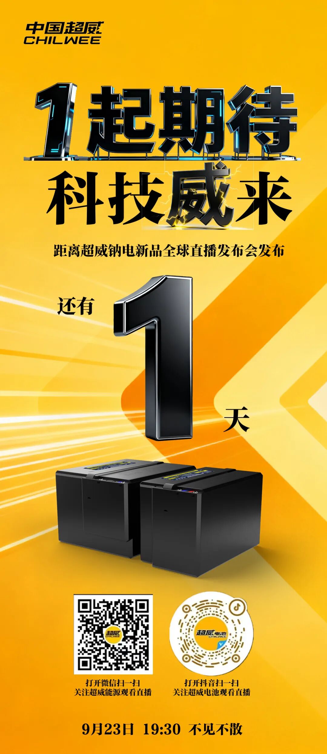 倒计时1天! 超威钠电 遥遥领先 超威钠电新品全球直播发布会即将震撼启幕 一场席卷新能源领域的绿色风暴 一个由创新驱动的钠电全新时代 超威集团诚邀您共同见证 这一改写行业格...