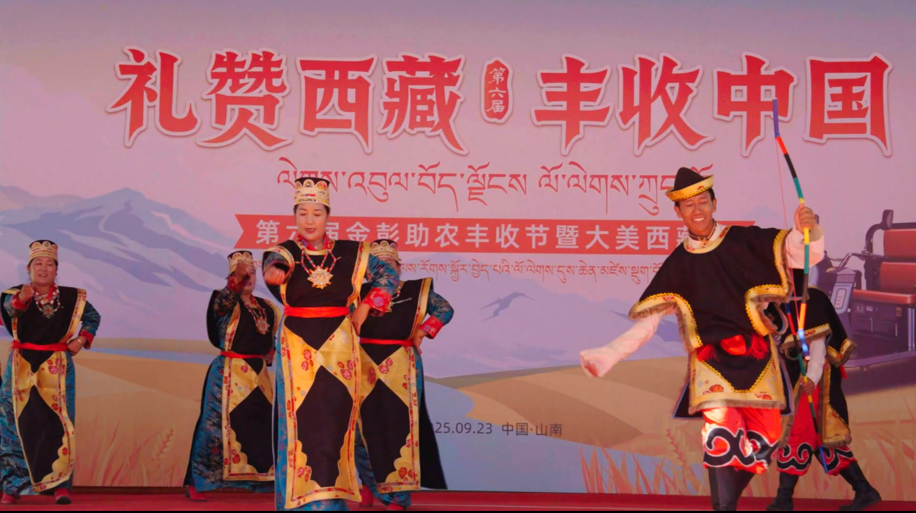 庆丰收环节,当地藏族村民进行精彩的节目表演。二十位藏族村民代表载歌载舞,淋漓尽致地展现了雪域高原独具特色的民俗风情和丰收后的由衷喜悦。