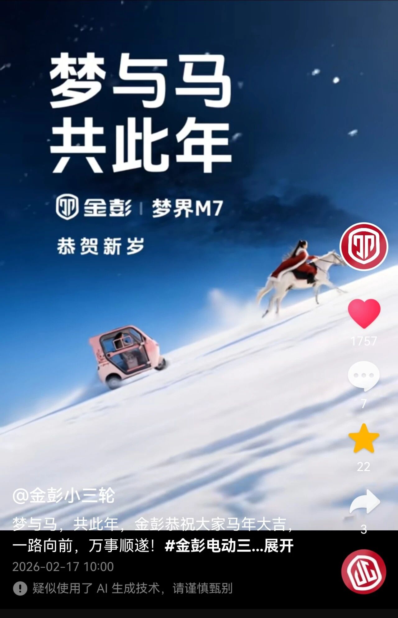马年的春节已经告一段落,但是营销的故事永不落幕!盘点2026年的CNY营销,金彭休三的AI大片绝对值得点赞! 金彭休三以梦与马,共此年为主题,优美的文案,岁月的情怀,祝愿和向往...