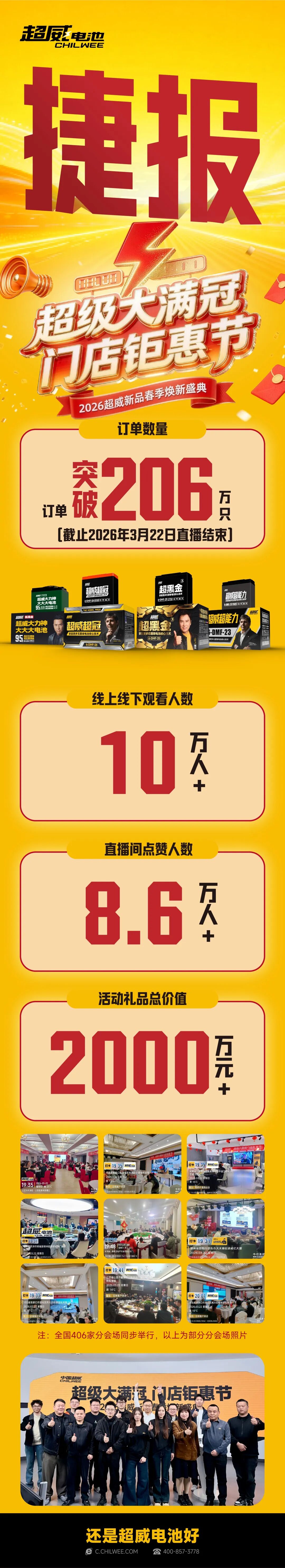 3月22日,超级大满冠,门店钜惠节2026超威新品春季焕新盛典圆满举行。作为第一届超威全国门店钜惠节,本次盛典采用超威集团线上主会场 + 全国406家代理商线下分会场同步联动模式,...