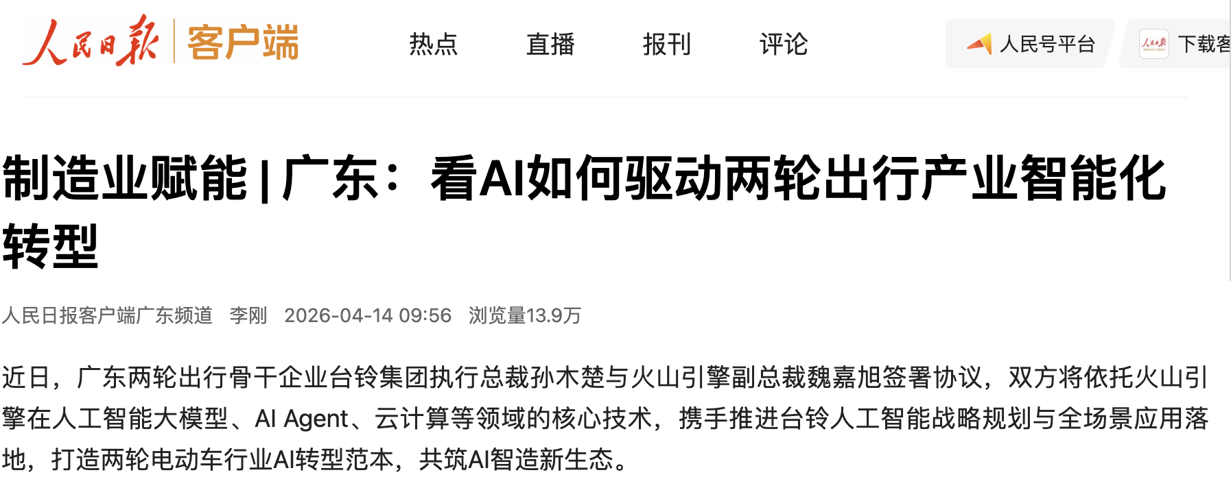 人民日报热评:台铃科技×火山引擎,引领两轮电动产业迈入AI全域赋能