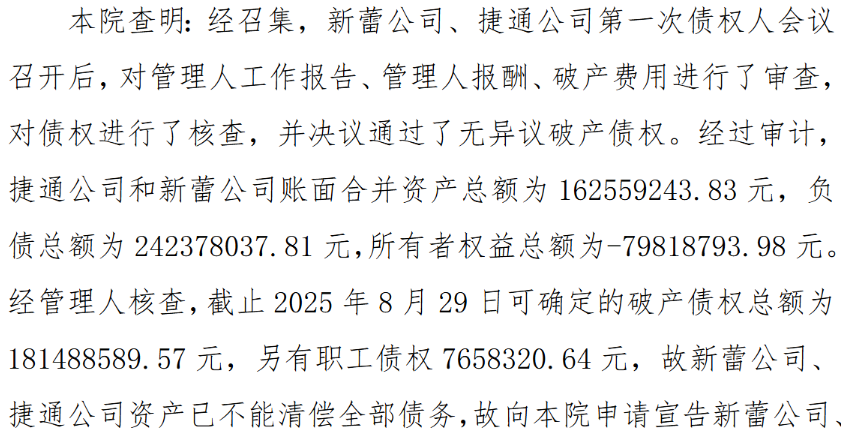 据全国企业破产重整案件信息网刊载的无锡市锡山区人民法院(2025)苏 0205破 44号之二民事裁定书的披露,新蕾品牌的持有和运营企业(捷通公司和新蕾公司)账面合并资产总额为 162559243.83元(约1.63亿),负债总额为 242378037.81元(约2.4亿),属于明显的资不抵债,并且差额还不小。