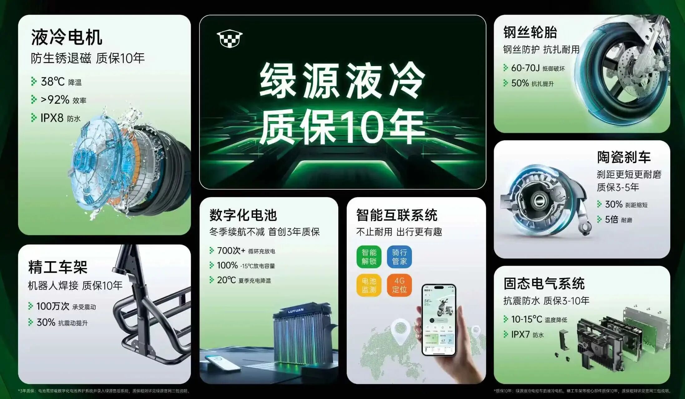 据绿源集团相关资料披露,目前绿源累计获得专利超1300项,有效期内专利超1000项。围绕“耐用”核心,构建一套系统性解决方案,多次被央视、新华社等国家级媒体报道并盛赞,尤其2019年推出的液冷电机技术,把绝缘冷却液注入电机内部,电机工作时,及时将产生的热量散到金属外壳上,再通过骑行时的风散热,和普通电机相比,温度降低30多度,从物理层面杜绝了高温退磁和氧化锈蚀。2023年推出液冷2.0系统,液冷电机2.0的绝缘冷却液搭配石墨烯散热涂层,强效降温38℃,IPX8级防水,电机效率>92%,得到市场和用户一致好评,成为行业共识。